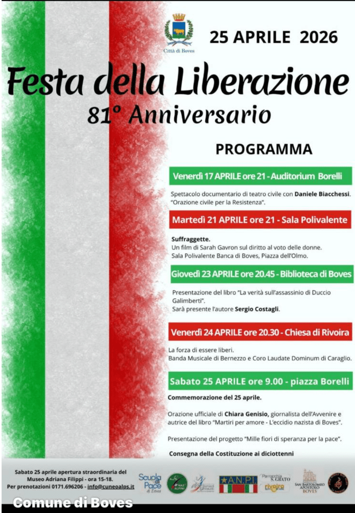 Ma la libertà non è solo un diritto, è anche una responsabilità. Richiede di essere consapevoli delle proprie azioni e delle loro conseguenze, di rispettare le libertà altrui e di contribuire al bene comune. In Italia, la libertà è un valore fondamentale, sancito dalla Costituzione e celebrato ogni anno il 25 aprile, Festa della Liberazione. Godiamo della LIBERTÀ da ben 81 anni grazie al sacrificio di molti! Con la Banda Musicale di Bernezzo e con il Coro Laudate Dominun di Caraglio “festeggeremo” la LIBERTÀ nella Chiesa Parrocchiale di Rivoira di BOVES, venerdì 24 aprile alle ore 20,30. Organizzano questo evento speciale l’Associazione “Rivoira, terra di vita” , la Parrocchia di San Grato, il Comune di Boves con il sostegno della Fondazione Crc.
